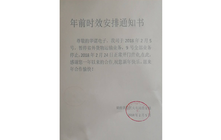 尊敬的新老客戶您好: 新春伊始,萬象更新惜別2017年,迎來充滿希望的2018年,再次感謝新老客戶對鶴壁華諾電子的支持與信任。我們將繼續以優質的產品、真誠細致的服務與您攜手在2018年,互惠雙贏、共同成長。 2018年春節假期將至,為方便您合理安排訂貨時間、保證我司正常的供貨周期,現...